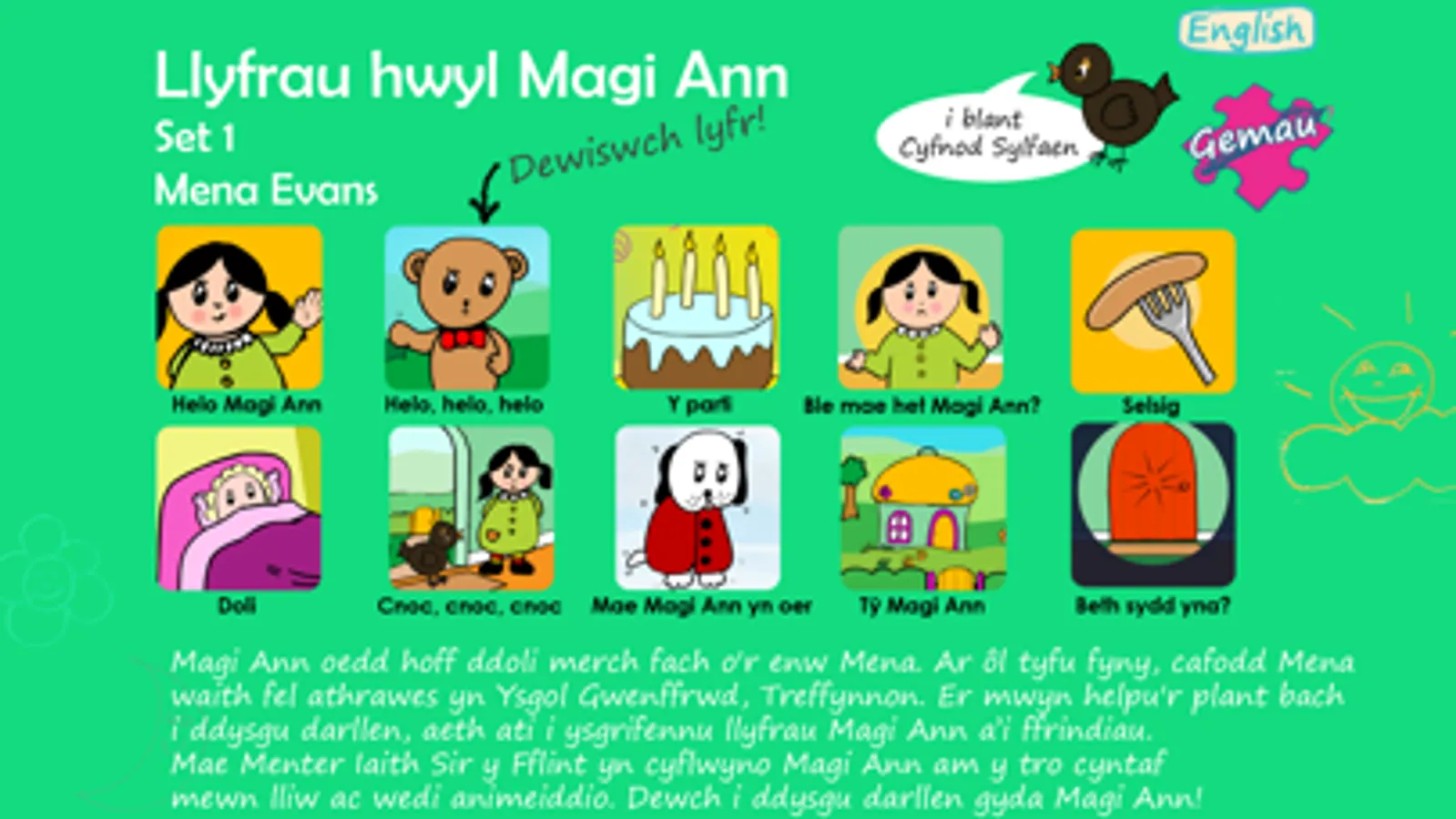 Dewch i ddarllen gyda Magi Ann, Pero, Tedi, Doli a Dicw