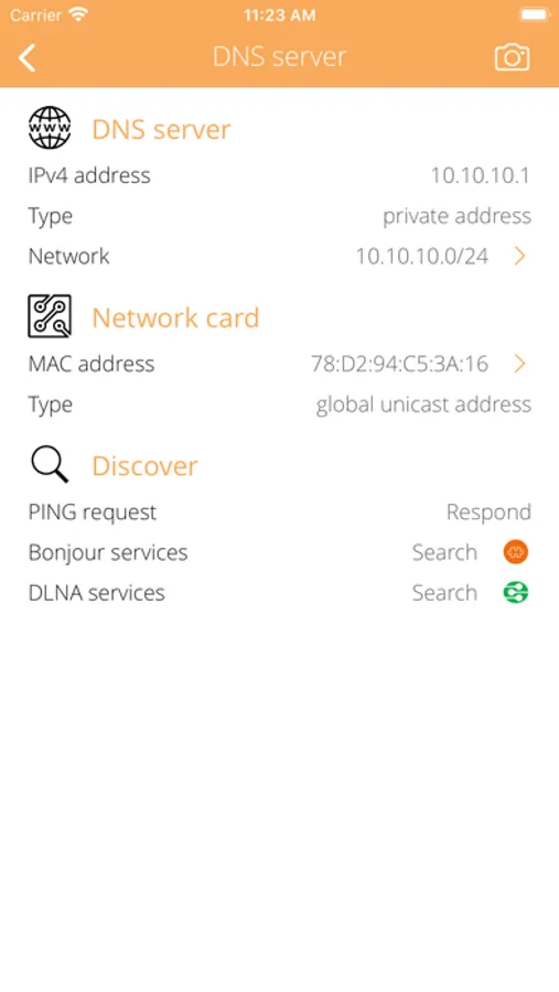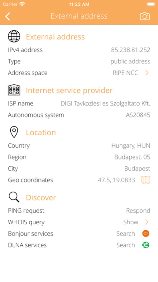 • Show hostname, network type, MAC address (on Wi-Fi network only), PING capability, WHOIS record for each default gateway.