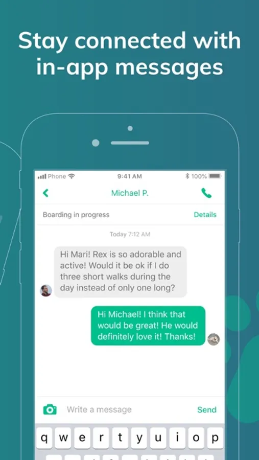 In-app messaging so you can easily communicate with your Pet Caregiver.