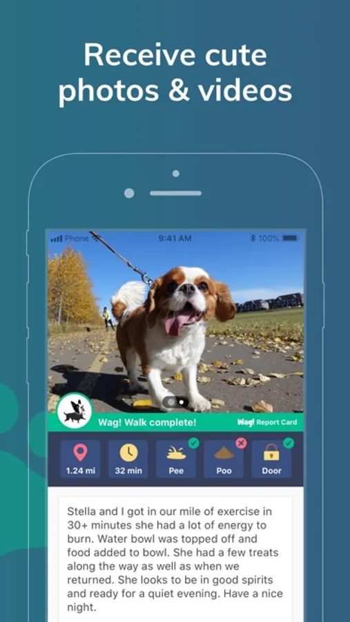 Receive live pee/poop notifications and a detailed report card at the end of your service.