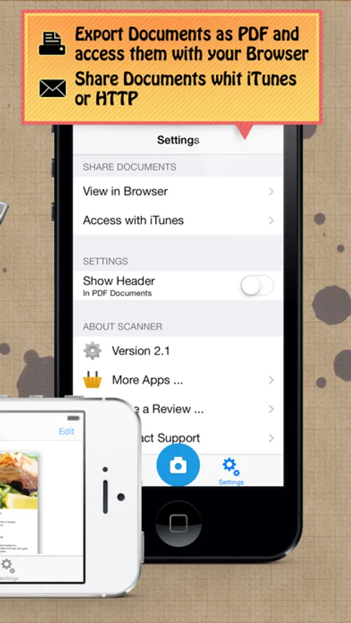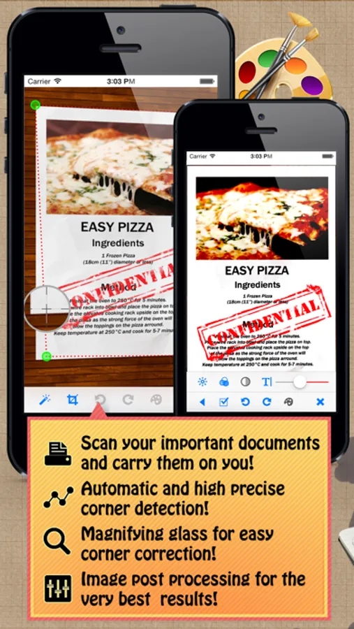 It has never been easier to scan documents without an extra hardware device. Just make a picture of your document, the application does the rest! An advanced algorithm will automatically detect the corners and remove any distortion. You end up with a perfect scan in no time!