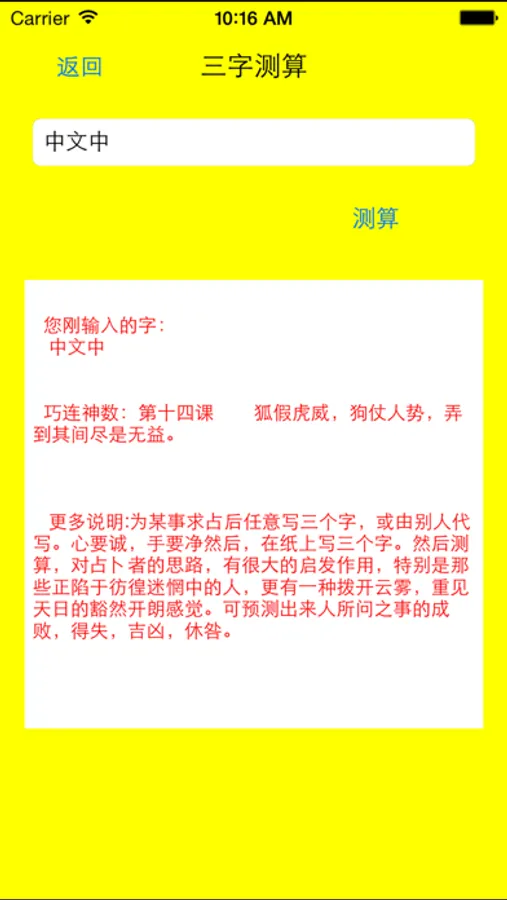 当你心有疑云,踌躇不解时,亦或想起名、算事、测字时,可以凭借此软件来测试,测试要随心而起,不可绞尽脑汁斟酌再三而测。也不可尽信测算的结果,只能给你参考所用
