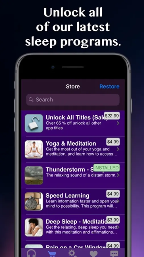 Browse the store for other great Sleep Learning programs or use the UNLOCK ALL in-app for over 70% savings. All in-app products were chosen to help strengthen your mental power, focus, and create a positive attitude for success.