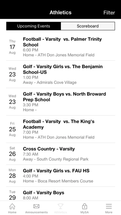 - Review athletic event details, including opponents, game results, recap commentaries, and more