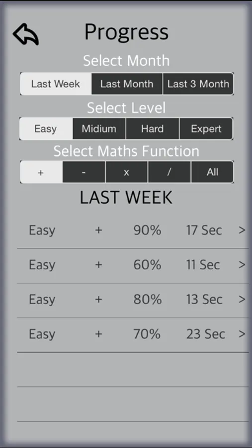 - If parent and teacher want to see progress report,than they can easily view this report on history page,and show recently last 3 month progress result. They can filter this report on the based on operation,level.so parents help this for viewing individual math operation with different level.