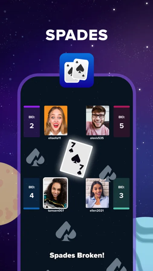 • SPADES - The classic team-based card game. Team up and try using telepathy to communicate with your partner without alerting your opponents. Get ready to take tricks, but be sure not to take too many bags! Any fan of Spades should check this out!