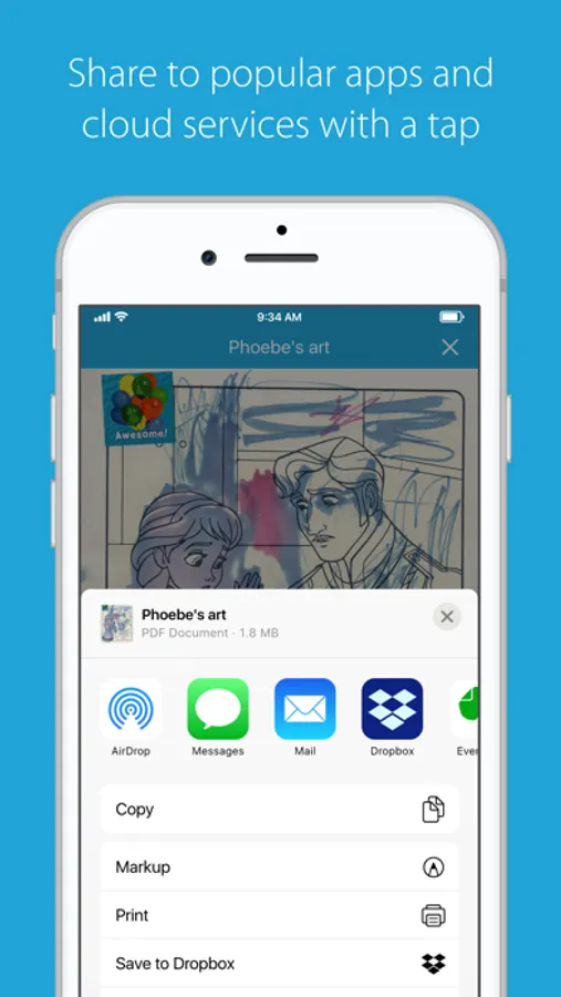 - Save and send scans to Mail, iMessage, or other apps on your device (including Dropbox, OneNote, and Evernote)