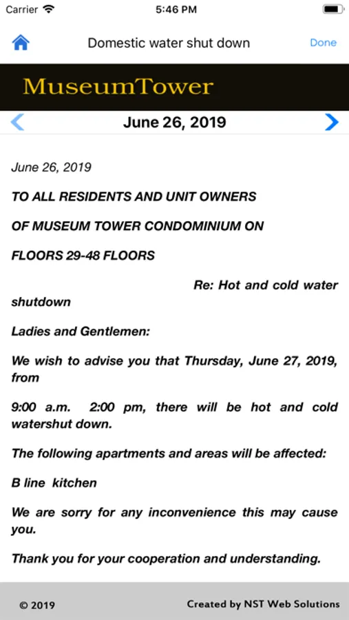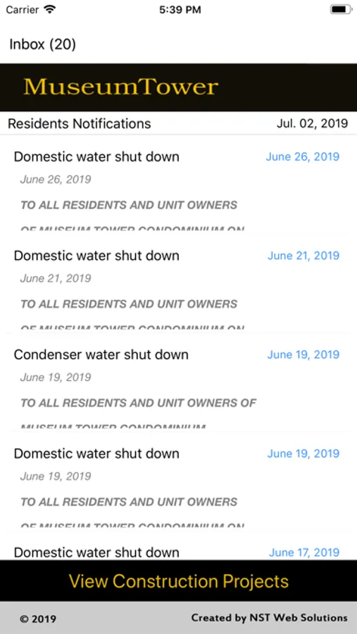 The application serves as a notification of messages to residents of the Museum Tower. Messages are served to the user in a date descending order and messages that are made inactive are dropped from the list. Messages are managed directly by the Management Staff at Museum Tower.