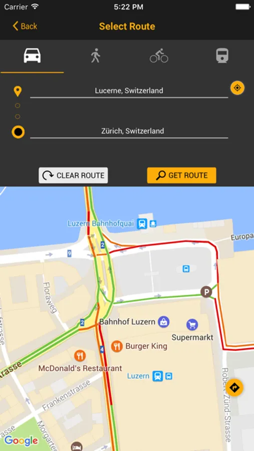 1. First, use the ON THE WAY app to see the best route between Lucerne and Zurich. The app shows the route with a travel time of 44 mins by car.