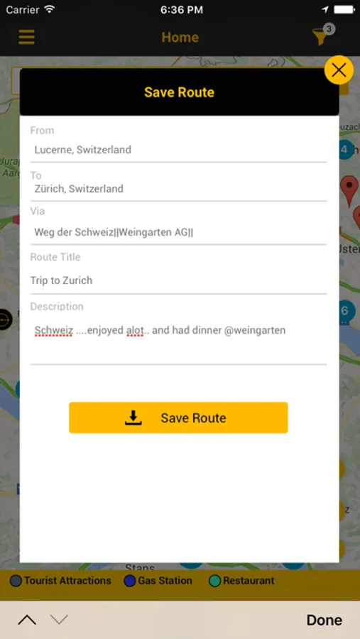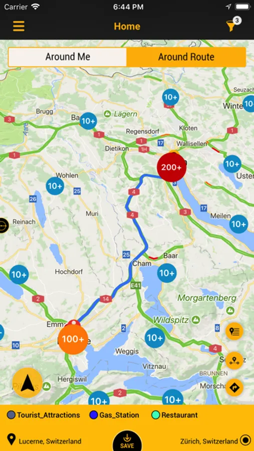 2. Now to view all tourist attractions, gas station, and restaurants around this route, simply add these 3 categories to the map filter and the app will find a host of such types of places all along your selected route from Lucerne to Zurich. Each location is represented on the map by a pin of the category’s color. Sometimes, due to many places in close proximity, they might be shown in clusters, that can be expanded on a click.