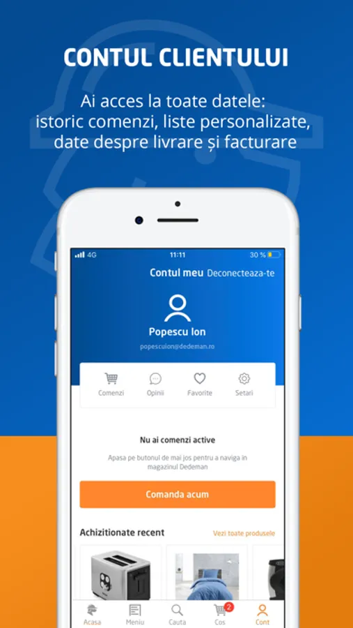 Te poți autentifica rapid în contul tău atât în aplicație, cât și pe site-ul Dedeman, prin introducerea adresei de e-mail și a parolei setate. Astfel, vei avea permanent acces la date precum: istoricul comenzilor, date de livrare și facturare, liste personalizate cu produse favorite, etc.
