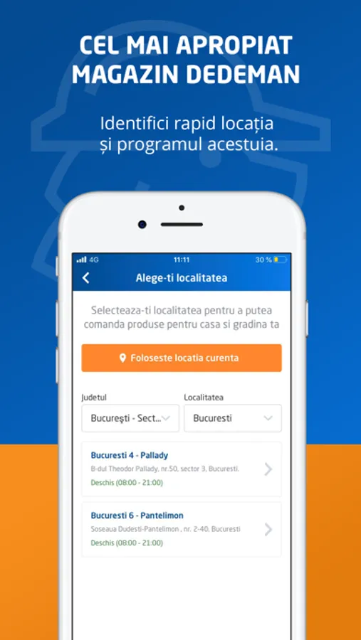 Selectează-ți județul și localitatea sau permite aplicației să acceseze locația dispozitivului și astfel identifici rapid cel mai apropiat magazin Dedeman și programul acestuia.