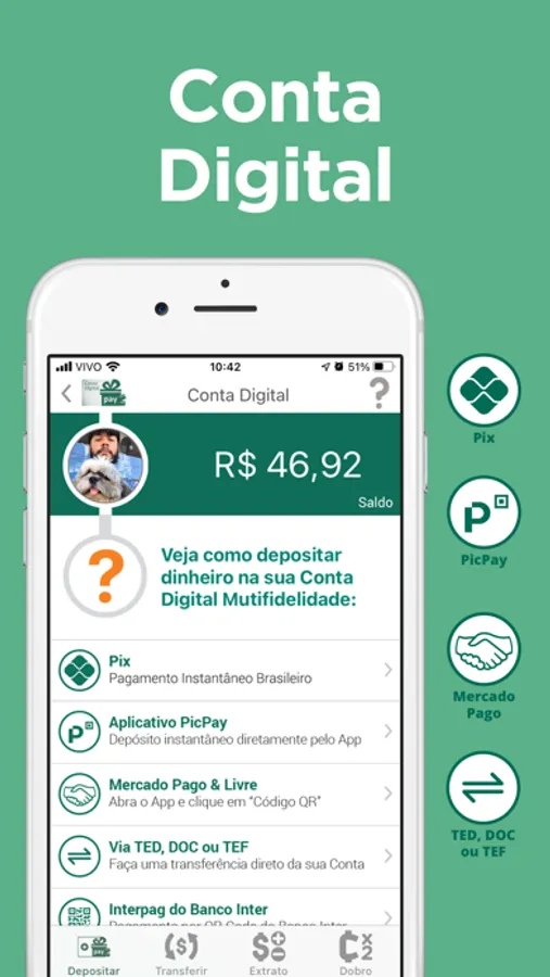 Realize depósitos via Pix, PicPay e Mercado Pago na sua Conta Digital Multifidelidade.