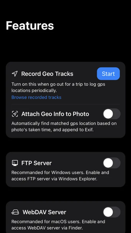 * Access photos saved in app from iCloud Drive or visiting FTP/WebDAV servers on your PC/Mac.