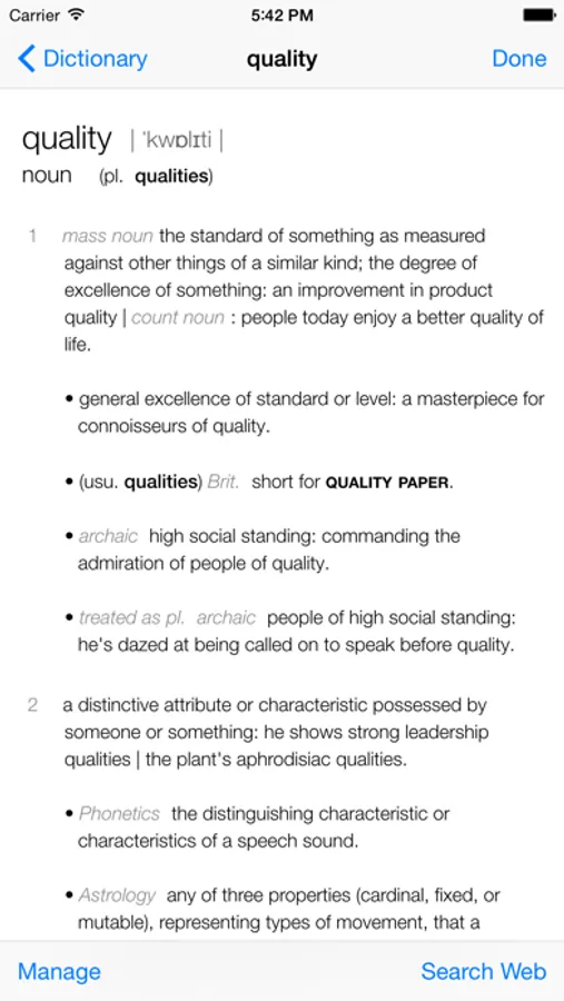 Shows word definitions.