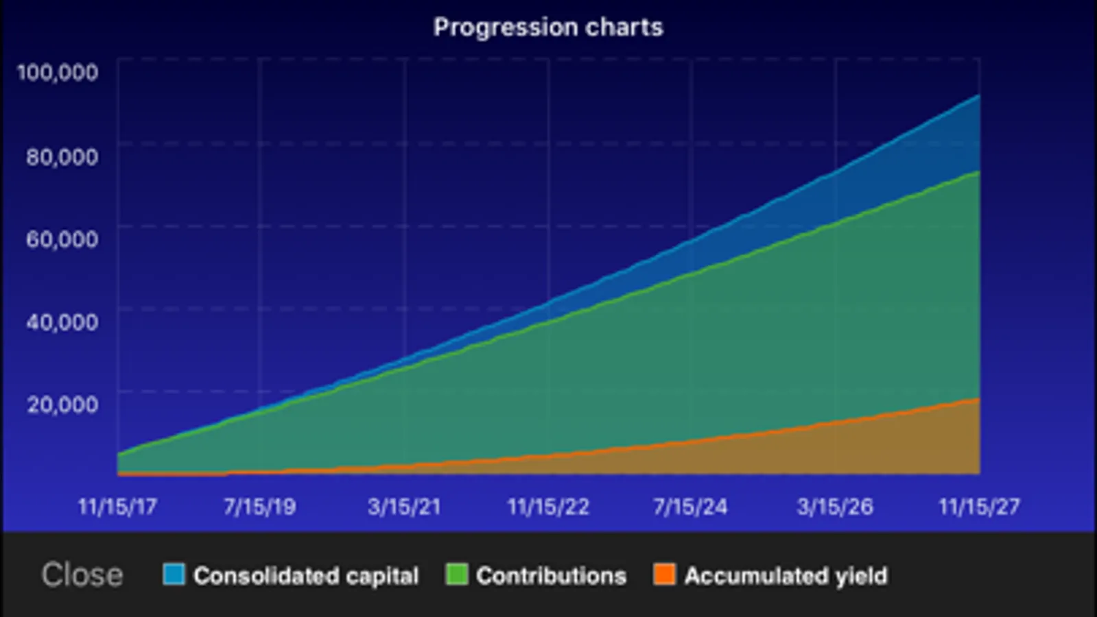 • Graph the evolution of consolidated capital, accumulated interest and accumulated contributions over the duration of the savings plan.