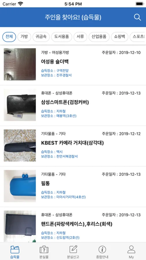 잃어버린 물건을 최대한 빨리 찾아드리기 위해서 경찰청 로스트112에 습득(분실)신고접수 된 유실물 정보를 제공하는 앱입니다.