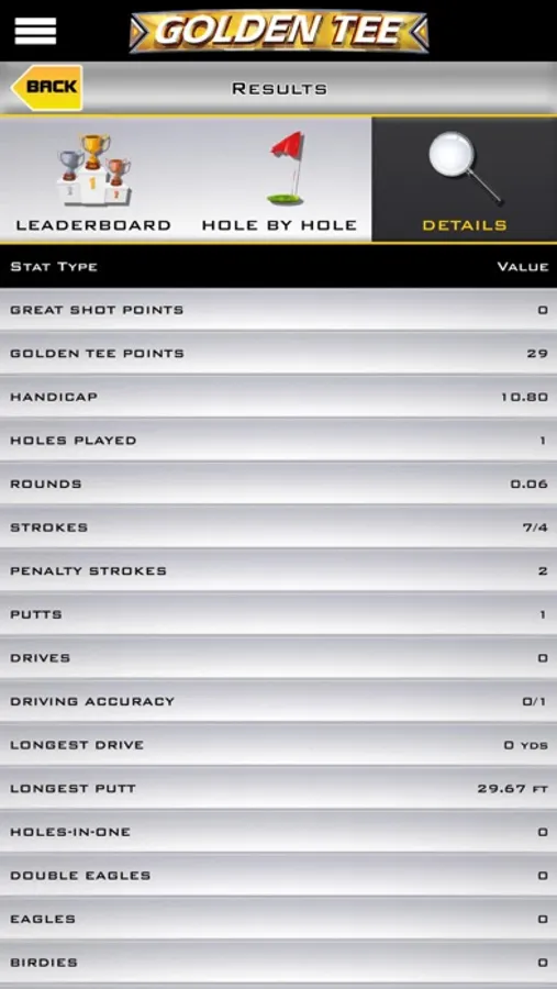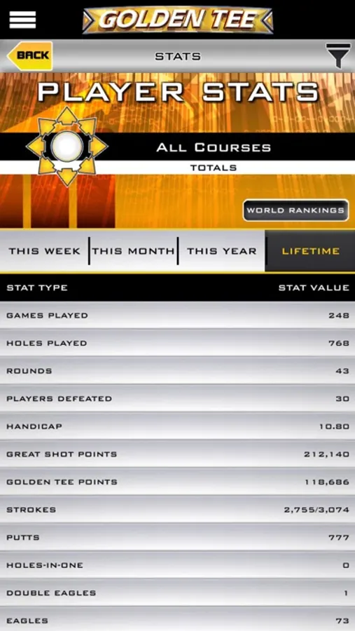 • In-depth stat-tracking: Want to see how you’ve played this week? This month? This year? Or perhaps you’re interested in some all-time numbers, averages, and bests. Access your Golden Tee Web Account and enjoy stat overload!