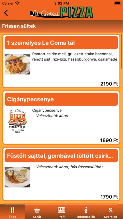 Éttermünkben a pizzák színes választékán kívül levesek, tészták, szárnyas, sertés, marha ételek, saláták,