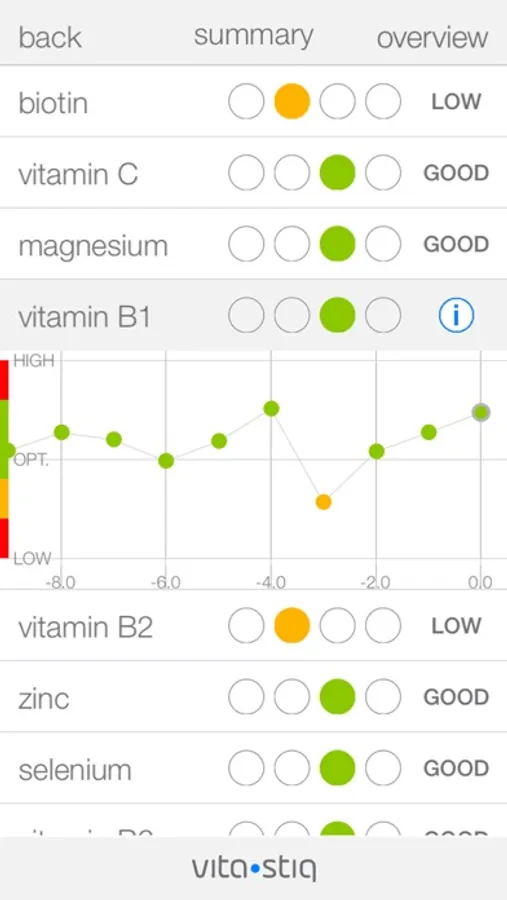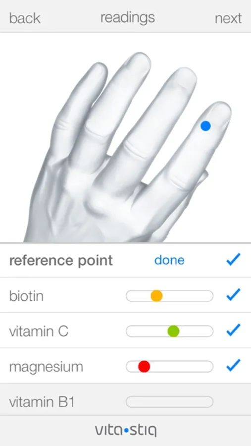 Vitastiq app guides you through each step while you are taking your vitamin and mineral readings. It helps indicate whether your general nutrient trend is low, high or just right.