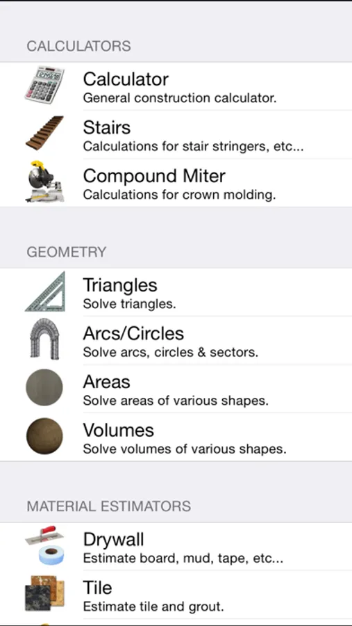 - Trigonometry calculator included for solving triangles, rise/run, rafters, slope, and more. Triangles are graphically mapped on your phone's screen to give a visual.