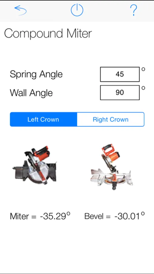 - Crown moulding module built in which supports any spring angle and any wall angle. Actually see the saw settings on your phone.