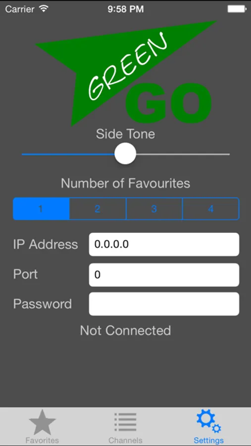 With this App you have the powerful Green-GO intercom system connected to your iPhone! It supports all the features of the Green-GO Beltpack when connected to a Green-GO Bridge. Just fill in the IP Address and port number of the Bridge and the iPhone will connect automatically. In the "Favourites" panel you can have the first 1, 2, 3, or 4 channels in a non scrolling list, so you can hit the buttons without looking. The "Channels" panel contains a list with all the channels. In the "Settings" panel you can fill in the connection details and verify the iPhone is connected.