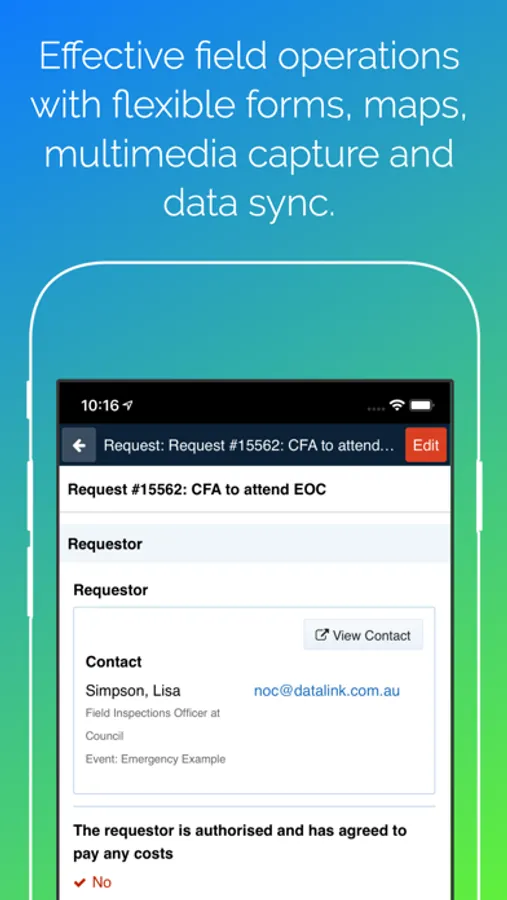 Take photos, fill in purpose-built forms and draw the impact scene onto an online map, then easily and automatically transfer your impact assessments and reports to Crisisworks to share, organise, respond and recover.