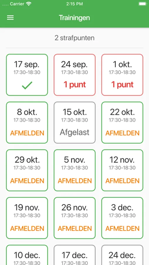 - Een overzicht van jouw trainingsdagen, inclusief aan- en afmelden en een overzicht van je strafpunten.