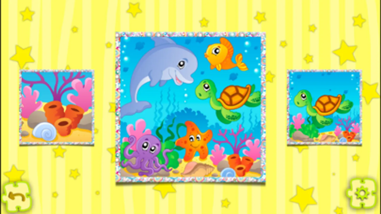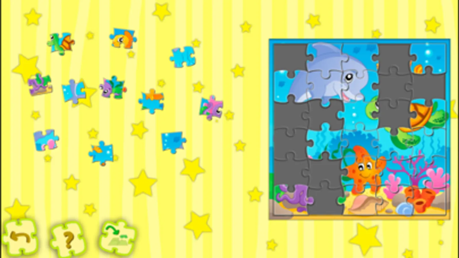 We present to your attention a fun colorful learning game puzzle for children. The meaning of the game is to collect the whole pictures of animals, fish, kids, furry monsters, etc of the fragments.