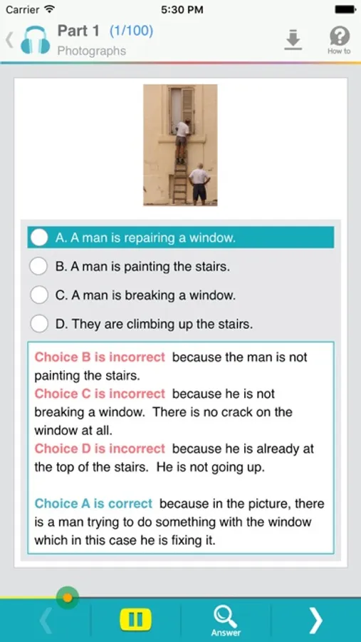 Part 1 - Photographs : You will listen to an audio about a picture in your TOEIC® test book then