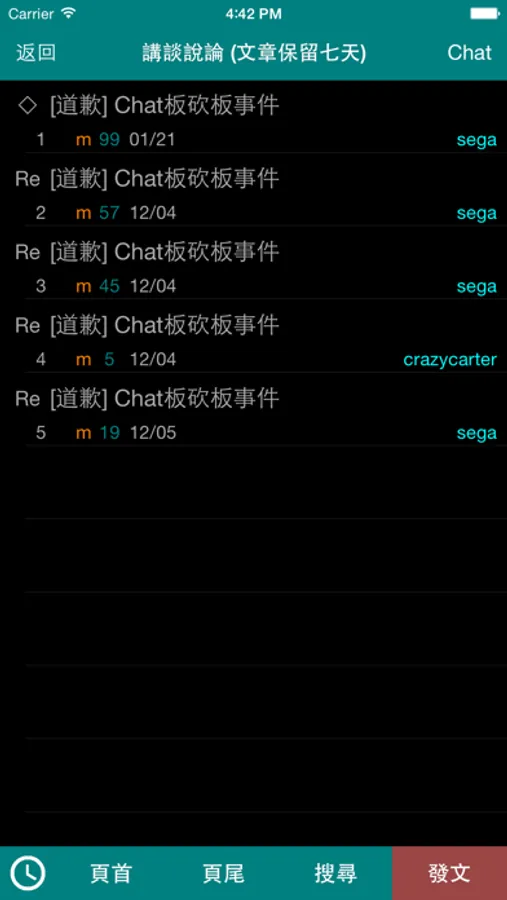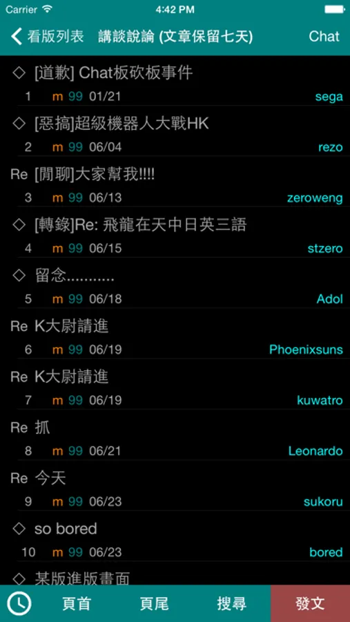 4. 觀看文章列表,提供搜尋、頁首(HOME)、頁尾(END)、上一頁(PGUP)、下一頁(PGDN)、搜尋(~)、稍後閱讀/歷史記錄、同文章首篇(=)、上一篇([)、下一篇(])、發文(Ctrl+p);長按文章之功能選項包含同主題串列、加入稍後閱讀、進階搜尋、複製文章編號(一般模式)、顯示原始編號(串文模式)以及查詢作者;左滑文章之功能選項包含推薦(GY)以及刪除文章(若為原作者)
