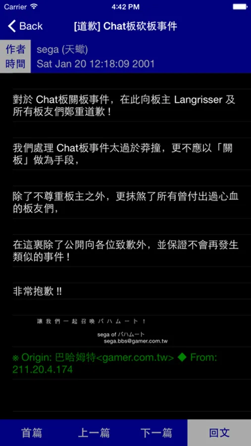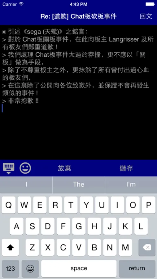 5. 觀看文章,提供首篇(=)、上一篇([)、下一篇(])、回文(Ctrl+r),另外點擊文章內容時可複製該行文字,或是開啟該行的超連結。文章內連結若為圖片,可在內文中載入圖片,長按圖片可儲存至手機。