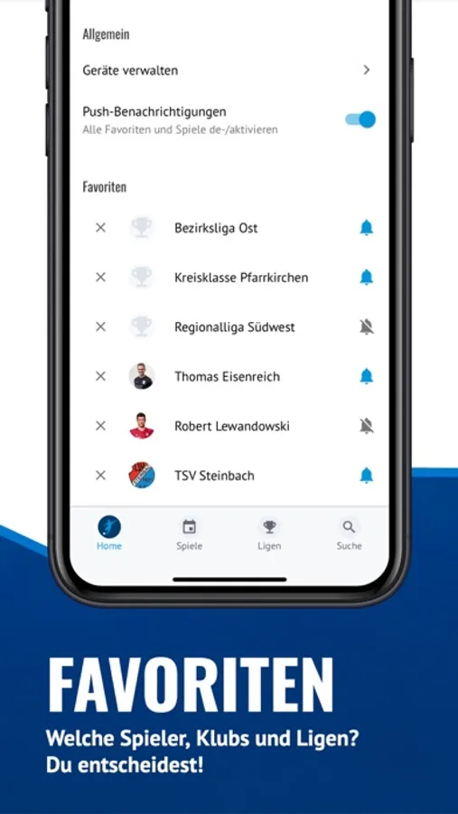 PUSH-CENTER - Pushe die Spielpaarungen, Ligen, Teams, Spieler oder ganze Vereine! In den Einstellungen kannst du die Pushes direkt alle editieren.