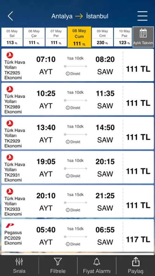 You can view the flights of over 500 airlines that provide domestic and international flight service, compare the flights and prices and easily find the most suitable ticket for you thanks to the Ucuzabilet’s mobile application. While comparing the flights and ticket prices of Turkish Airlines, Pegasus, Atlasglobal, SunExpress, Onur Air and Anadolujet that are the most reliable airlines in Turley for domestic flights and of world-leading airlines, Turkish airlines, KLM, Lufthansa, Emirates, British Airways, Alitalia being in the first place for international flights, you will reach all this information easily on a single screen. You can view all flights sorting by travel date, see flight ticket deals and buy the cheapest flight ticket and plan your travel within minutes.