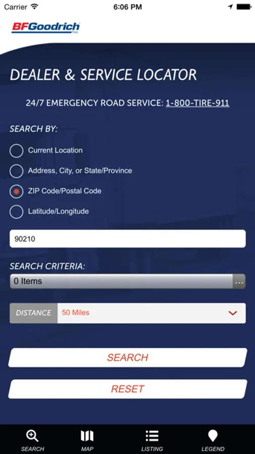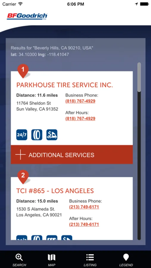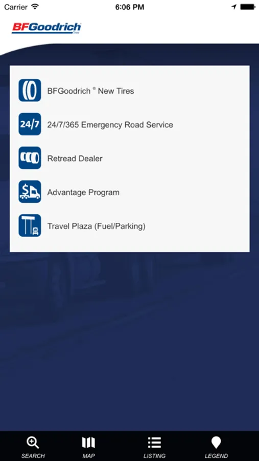 Now you can find the nearest BFGoodrich® truck tire or service provider wherever you go, using your iPhone. Use the app to search for a provider by category, including emergency roadside service, travel plazas, on-site tire service or retread providers, or use it to call 24/7 Emergency Road Service directly. The app finds the nearest service providers based on your GPS location, or another location you enter yourself. It also allows users to call the service provider.