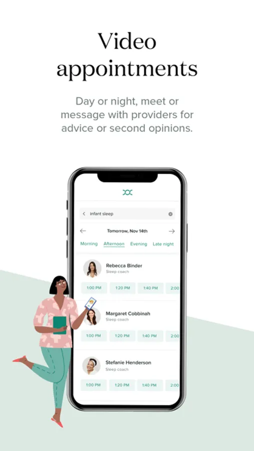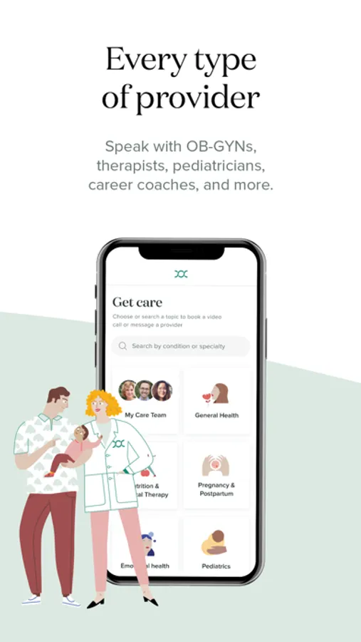 Same-day appointments: Video chat with 25+ types of specialists, like OB-GYNs, fertility educators, infant sleep coaches, and mental health providers.