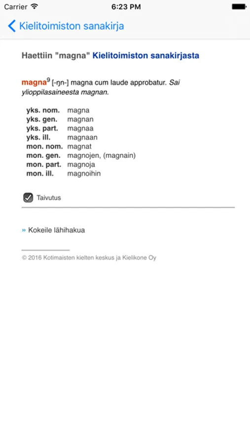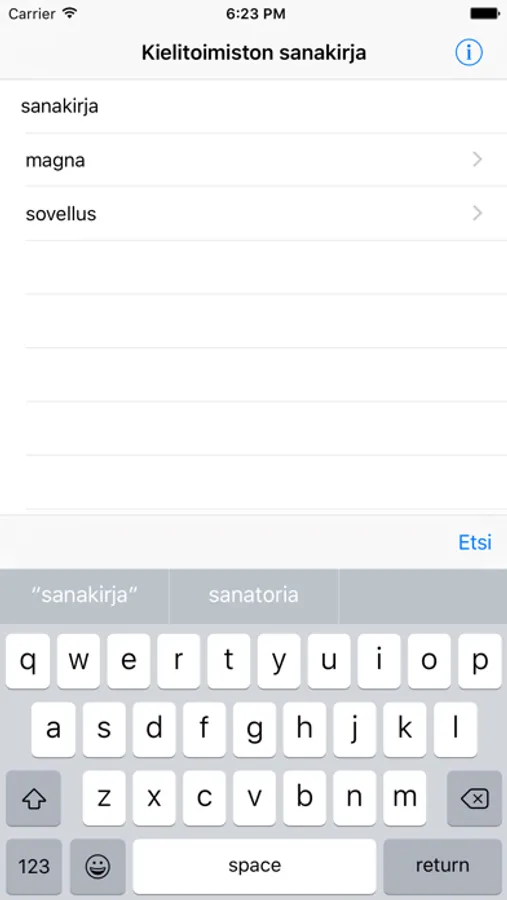 Helppokäyttöinen mobiilisovellus hakujen tekemiseen Kotimaisten kielten keskuksen ja Kielikone Oy:n julkaisemasta Kielitoimiston sanakirjasta. Ohjelma muistaa edelliset haetut sanat, joten tuloksiin on helppo palata myöhemmin.