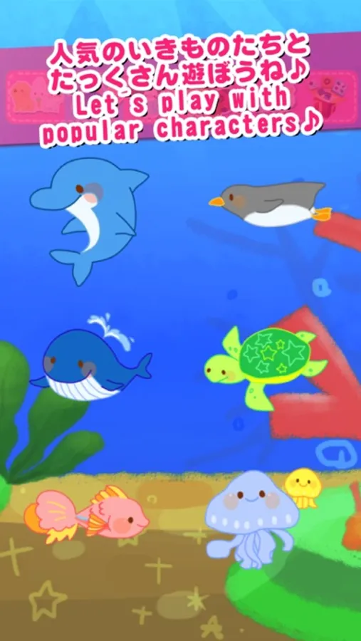 Dolphins, penguins, whales, sea turtles, fish, jellyfish