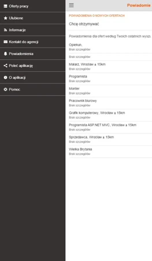 - Wyszukiwanie ofert pracy: podstawowe (stanowisko, kraj, miejscowość, odległość, geolokalizacja) zaawansowane (agencja zatrudnienia, branża, wysokość wynagrodzenia).
