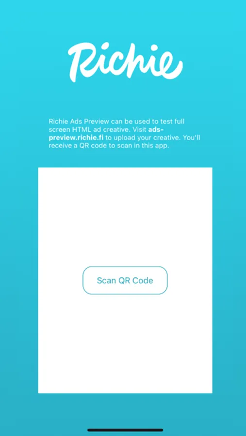 Start testing by visiting ads-preview.richie.fi to register for a free Richie Preview web console account. Use the app to scan QR codes generated in the Richie Preview web console, and you'll be able to preview your MRAID creative. To scan QR codes needed for previewing ad creatives, you'll need to give the app permission to access the camera on your device.