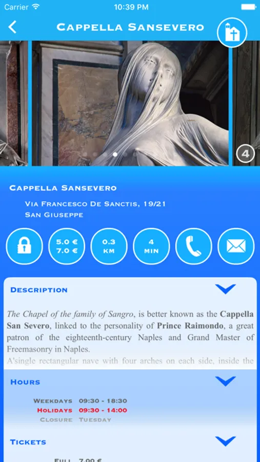 • Information about address, district, distance, travel time, opening times, ticket prices, phone numbers, emails and website.