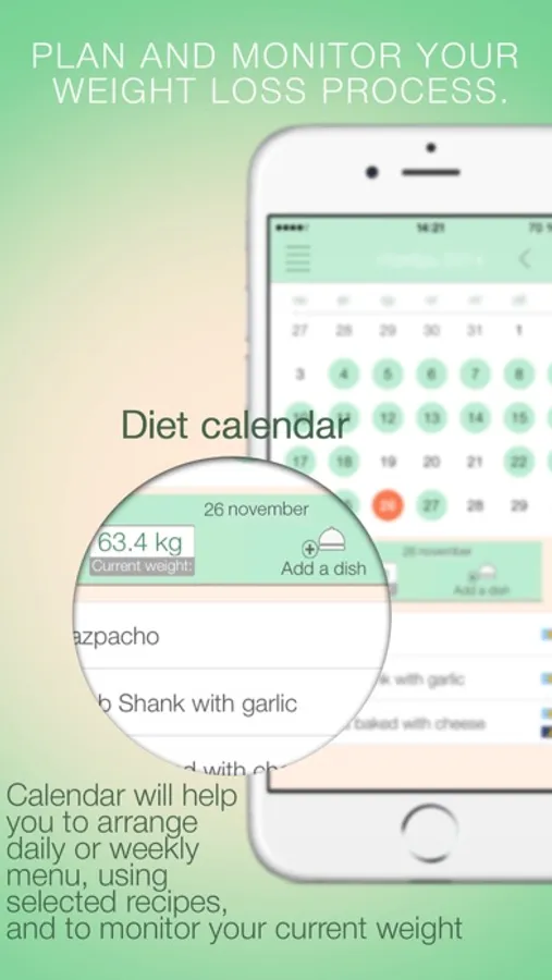 * Diet calendar can arrange your menu at least for month ahead! You can add your current weight to the calendar, to see your progress in weight control graph.
