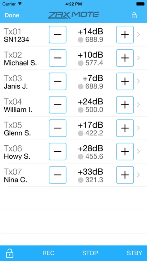 Use the Zaxmote app to wirelessly control Zaxcom Tx sound transmitters linked via a Zaxcom QIFB Bluetooth dongle attached to a Zaxcom QRX receiver. Quickly control transmitter gain, start/stop, and standby settings.
