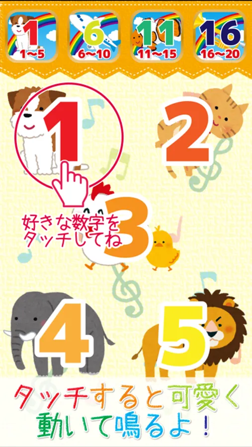 数字をタッチすると、「1」や「2」とおしゃべりをしながら動いてお子さまを楽しませる知育アプリです。
