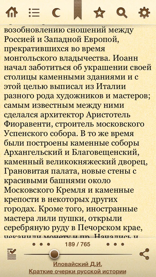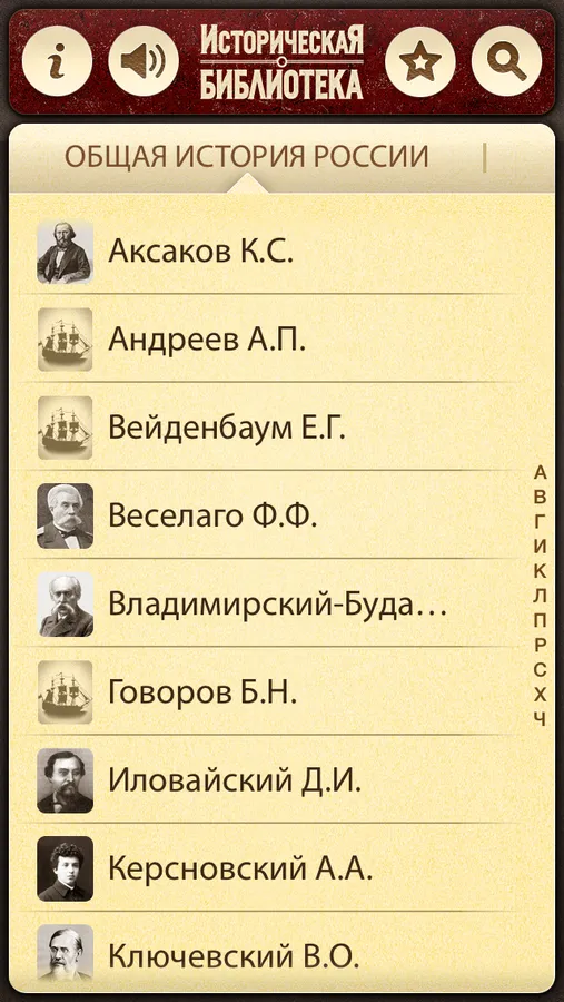 Купив приложение, вам будут сразу доступны 84 книги по общей истории России, среди которых: "История России с древнейших времён" С.М. Соловьева (29 томов), "Краткий курс по русской истории" В.О. Ключевского, "Русская история с древнейших времён" М.Н. Покровского (3 тома), "Полный курс лекций по русской истории" С.Ф. Платонова (3 тома), "История Русской армии" А.А. Керсновского, "Обзор истории русского права" М.Ф. Владимирского-Буданова, "Краткая история русского флота" Ф.Ф. Веселаго, "Алфавитно-справочный перечень государей русских" М.Д. Хмырова и многое другое.