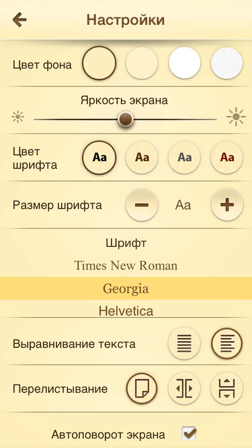 • Гибкие настройки отображения текста (выбор шрифта, изменения цвета и фактуры фона "бумаги")