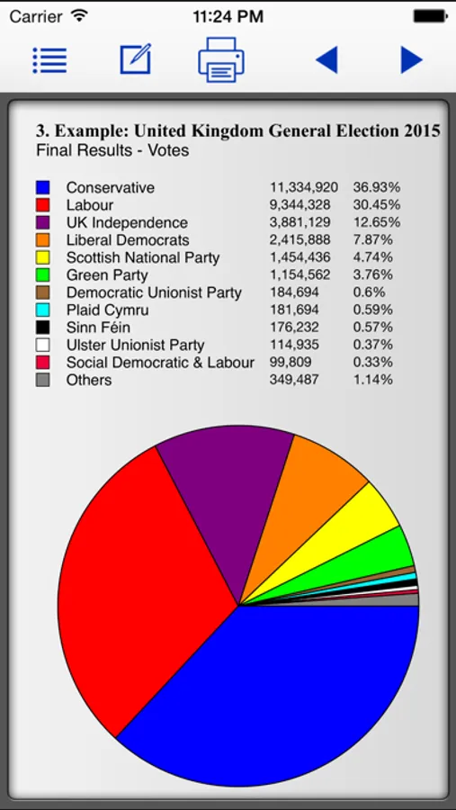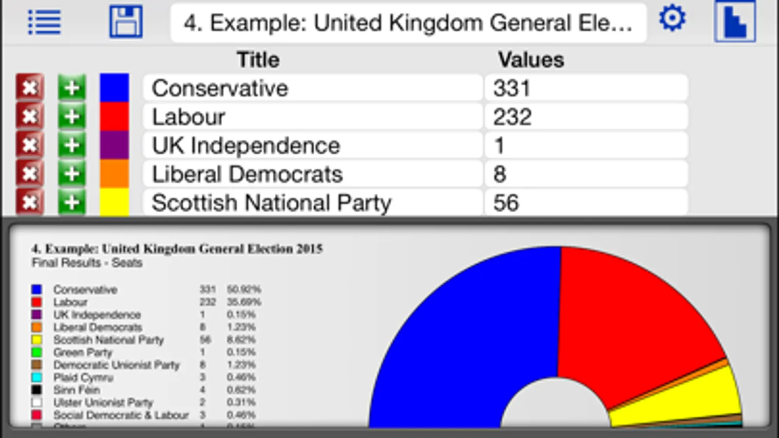 • While entering data, you can see the result chart (see example "UK General Election 2010")