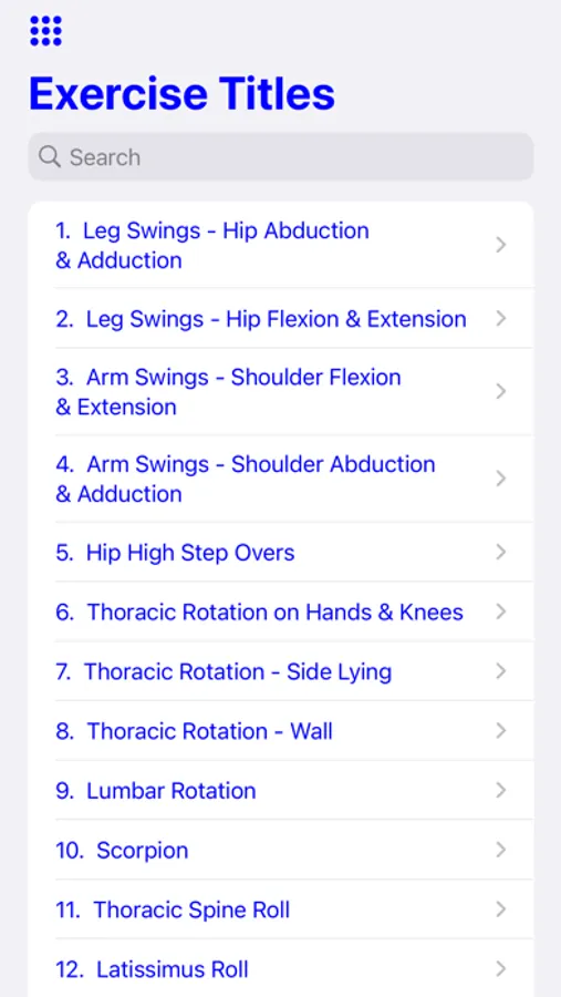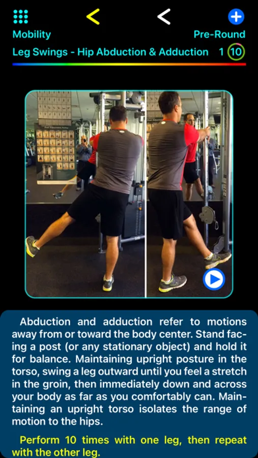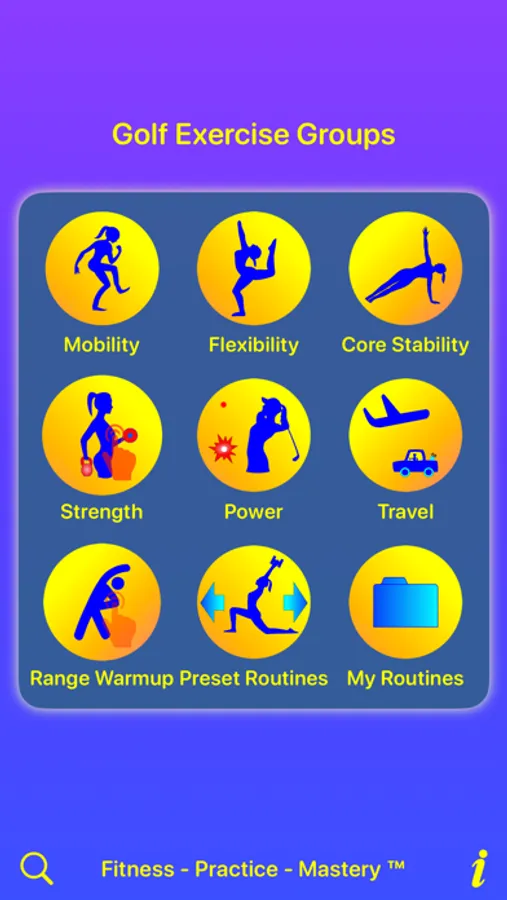 The exercises are divided into six groups: Mobility, Flexibility, Core Stability, Strength, Power, and Travel (travel exercises can be done without any equipment). Each group is further subdivided into 3 areas, each with a series of exercises. Most exercises include a video to show the correct technique. App also provides preset exercise sequences at three levels for your convenience. It also allows you to create up to three personal customized routines to select from the included exercises to suit your special needs and enhance your enjoyment.