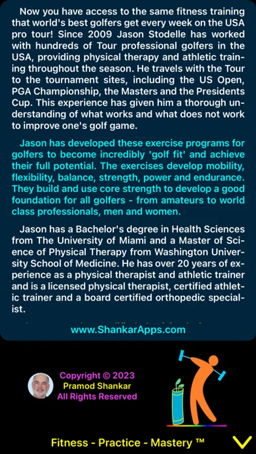 You now have access to the same fitness training that world's best golfers get every week on the USA pro tour! Since 2009 Jason Stodelle has worked with hundreds of tour professional golfers in the USA, providing physical therapy and athletic training throughout the year. He travels with the Tour to the tournament sites, including the US Open, PGA Championship, the Masters and the Presidents Cup. This experience has given him a thorough understanding of what works and what does not work to improve one's golf game.